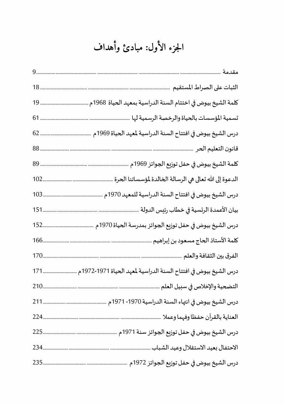 تطالعون بين دفتي هذا الكتاب الماتع في جزءه الأوَّل: معهد الحياة مبادئ وأهداف ... أجمل الكلمات التي خطَّها الشيخ إبراهيم بن عمر بيُّوض –رحمه الله- في مناسبات افتتاح السنوات الدراسية لمعهد الحياة العامر، أو اختتامها، وفي حفل توزيع الجوائز في مدرسة الحياة، وكان يعير لهذه المناسبات اهتمامًا بالغًا، لما لها من تأثير عاطفي قوي على الطلبة والأساتذة، وعلى علية القوم الذي يحضرونها وعامتهم، إذ يركز فيها على تحديد المبادئ الحقيقية التي أسس عليها التعليم الحر في جمعية الحياة، وبخاصة في المعهد.
