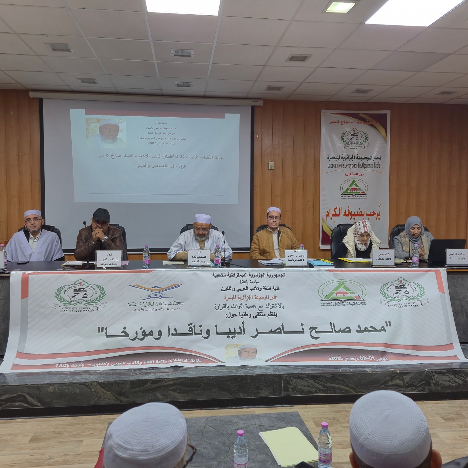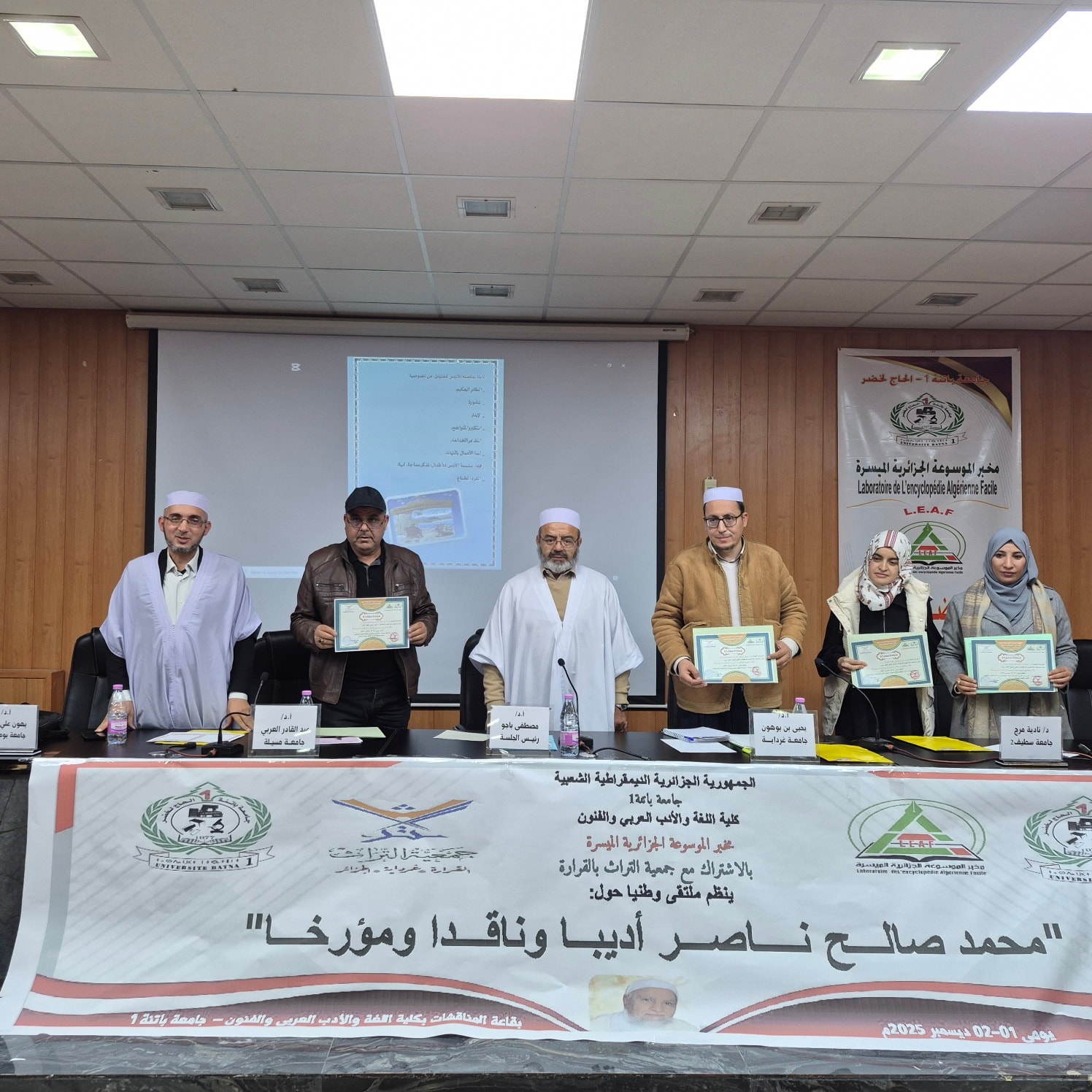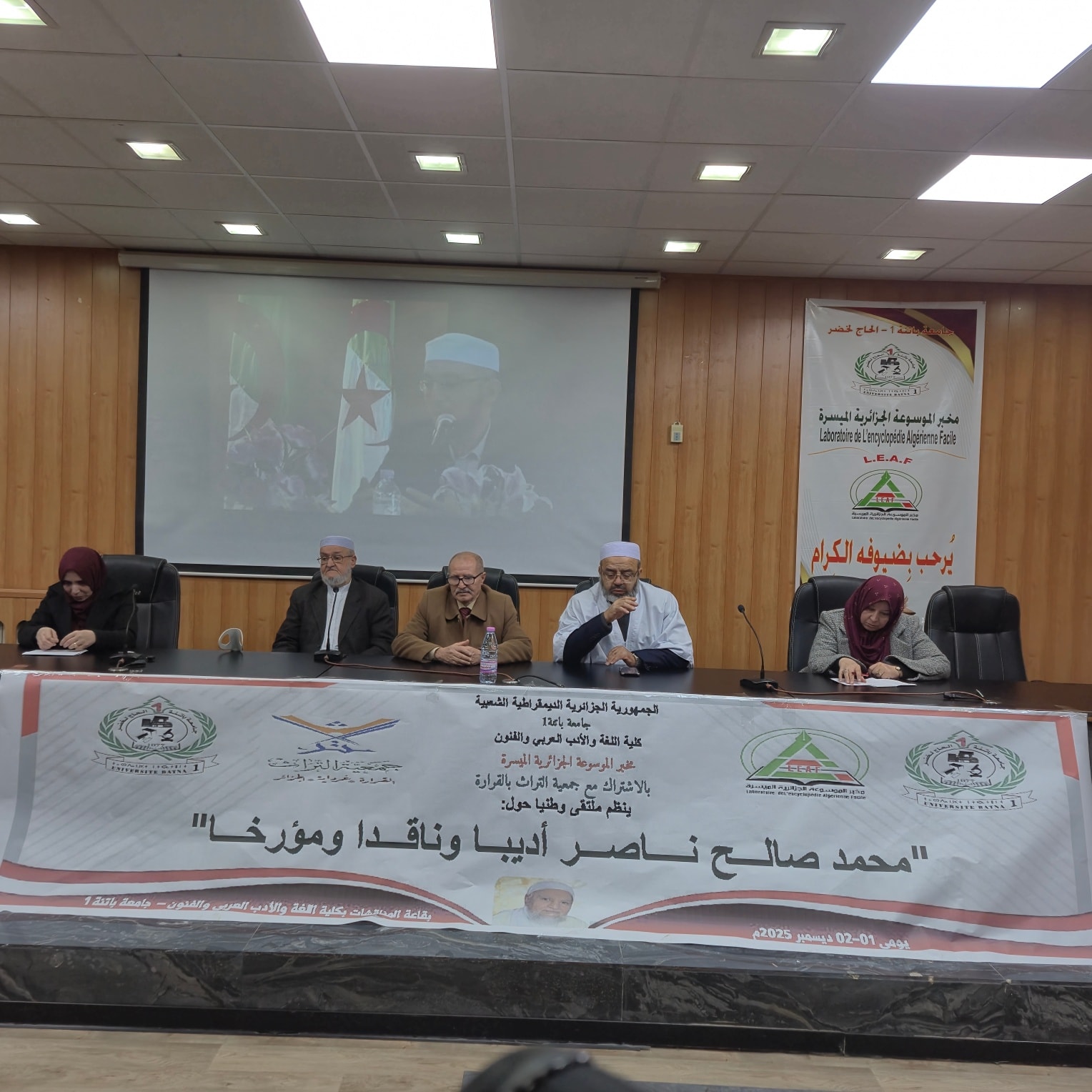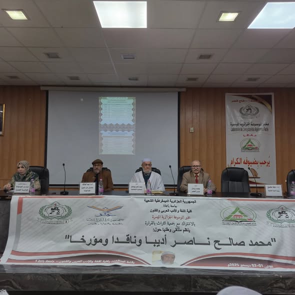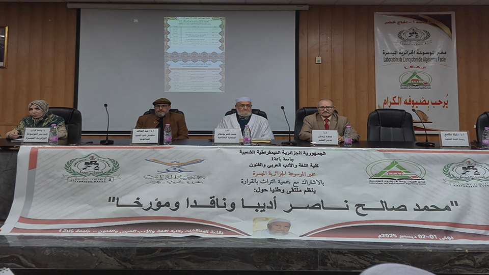 أقام مخبر الموسوعة الجزائريّة الميسّرة التّابع لكليّة اللّغة والأدب العربي والفنون (جامعة باتنة) بالتَّعاون مع جمعيّة التّراث (القرارة ولاية غرداية) الملتقى الوطني الموسوم: " محمد صالح ناصر أديبًا وناقدًا ومؤرّخًا " في قاعة المحاضرات بالكليّة يومي الإثنين والثّلاثاء: 10 و 11 جمادى الثّانية 1447هـ/ 01 و02 ديسمبر 2025م.