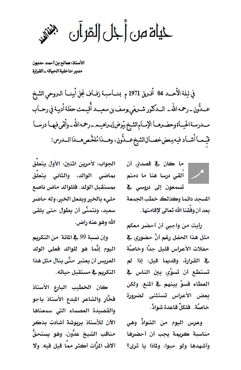 حياة من أجل القرآن - خطاب الشيخ بيوض حول الشيخ عدُّون